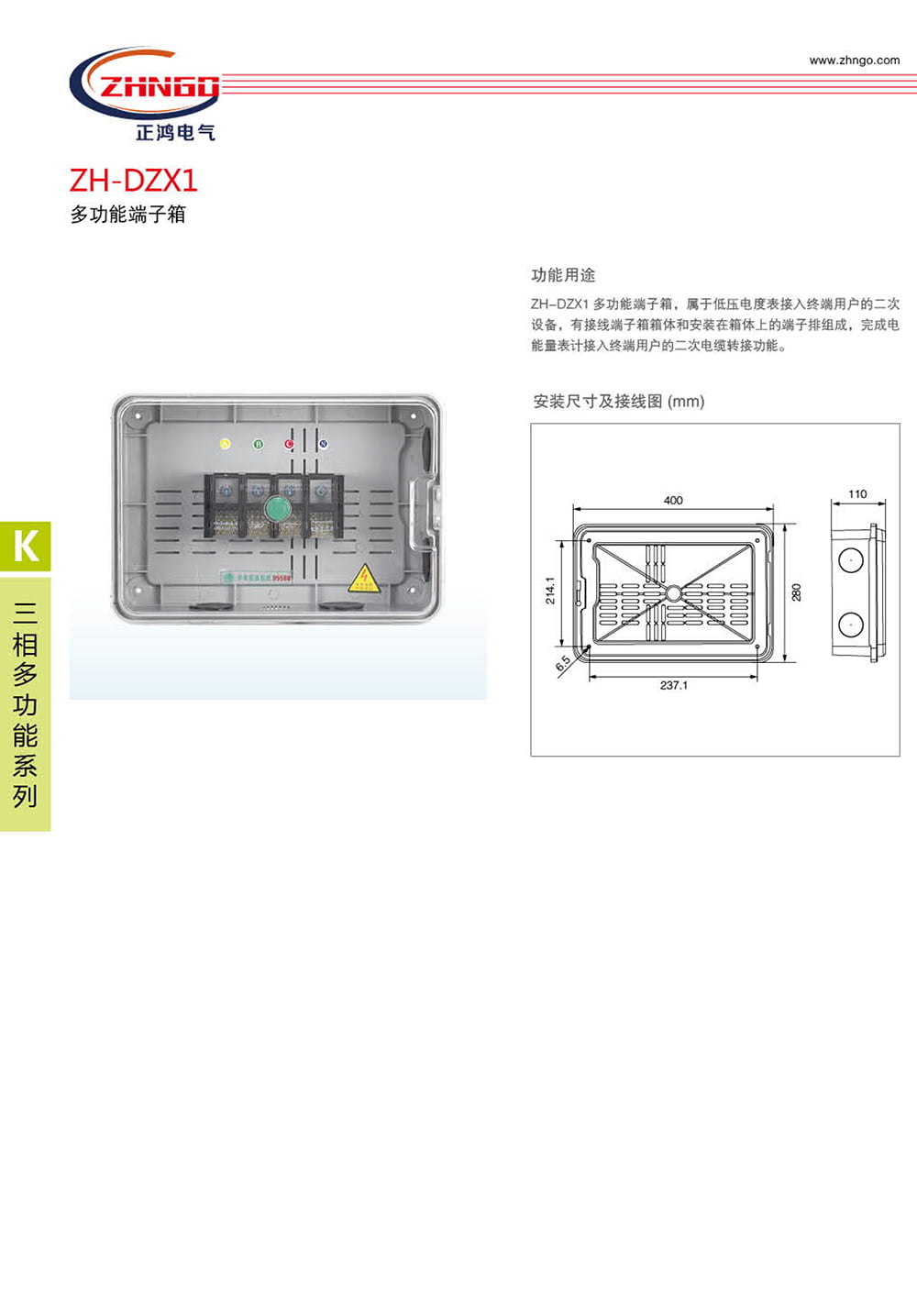 ZH-DZX1 多功能端子箱,屬于低壓電度表接入終端用戶(hù)的二次設(shè)備,有接線(xiàn)端子箱箱體和安裝在箱體上的端子排組成,完成電能量表計(jì)接入終端用戶(hù)的二次電纜轉(zhuǎn)接功能。